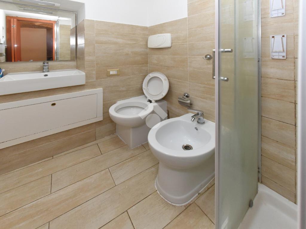 Il bagno è dotato di box doccia e la camera da letto è presenta la pompa di calore ad aria caldo/freddo.