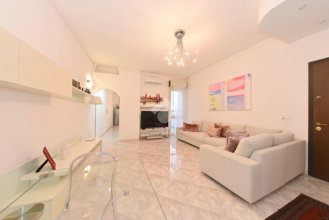 L'ingresso da accesso all'ampio soggiorno. La stanza è dotata di pompa di calore e di portafinestra che accede all'ampio balcone chiuso.