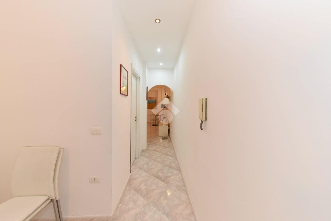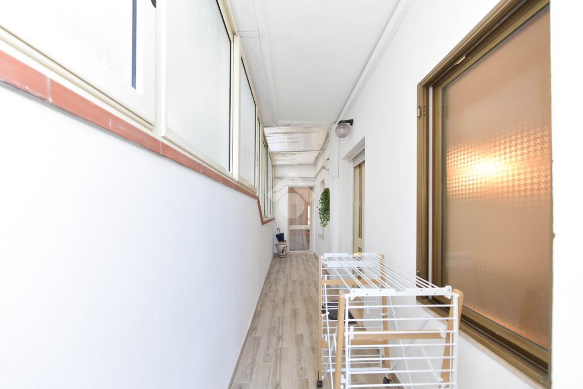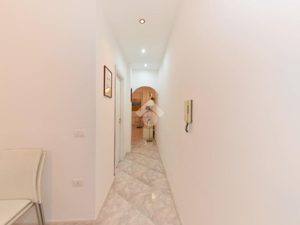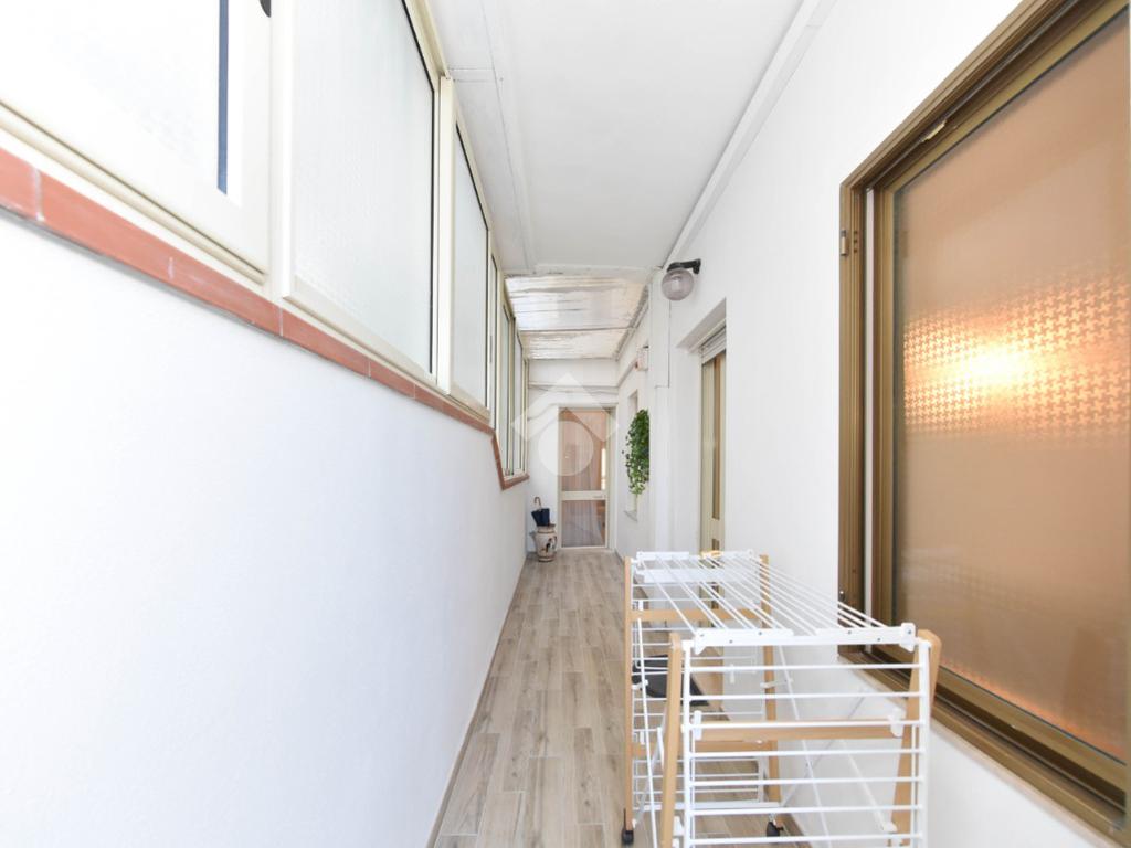 Il disimpegno conduce al bagno e alla cucina abitabile. Questa ha due punti luce di cui una portafinestra ampia che da anch'essa accesso al balcone chiuso.