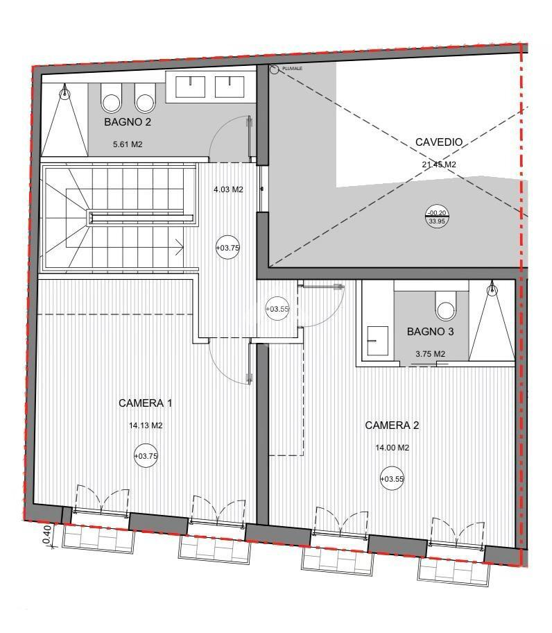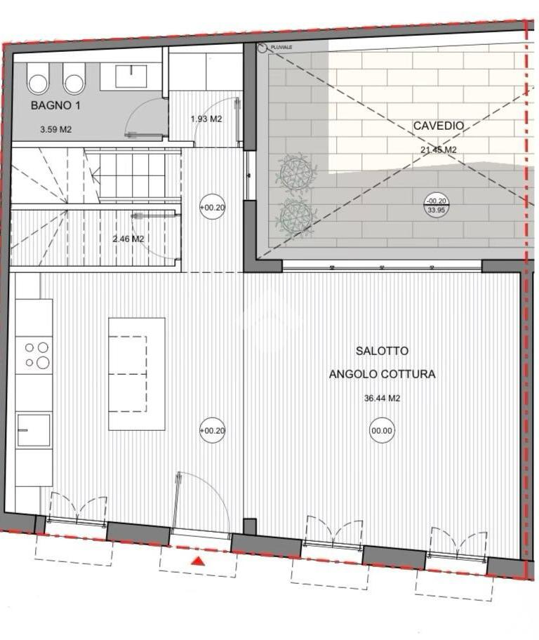 Il Trilocale può essere realizzato su due livelli con al piano terra il soggiorno con l'angolo cottura e il bagno mentre al secondo piano le due camere ed il bagno.